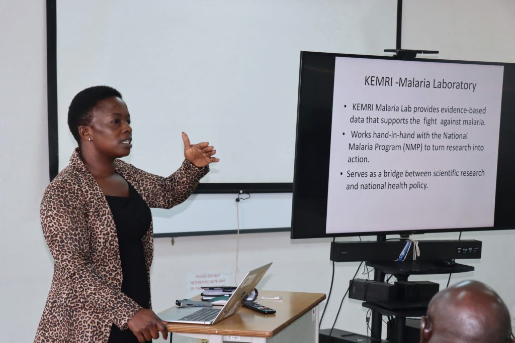 The delegation was also briefed on KEMRI’s pioneering innovations in malaria diagnostics and treatment, including the development of Plasmocheck, a locally designed diagnostic product that has enhanced malaria detection and strengthened Kenya’s biomedical self-reliance. CBRD’s Ms. Maureen Otinga traced the evolution of malaria treatment from early reliance on chloroquine to the widespread adoption of artemisinin-based combination therapies (ACTs), reflecting adaptive research guided by emerging scientific evidence. In addition, the role of KEMRI’s entomology laboratories in molecular surveillance, vector identification, and insecticide resistance monitoring was highlighted as a cornerstone of the national vector control programme. KEMRI’s technical contributions to the Kenya Malaria Strategy and the formulation of national guidelines for the management of Anopheles stephensi further demonstrated the Institute’s leadership in policy support and research translation.